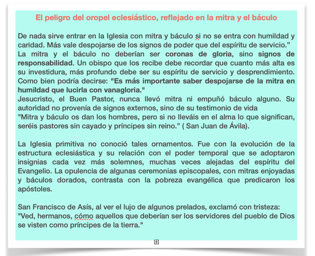 San Juan de Ávila y otros maestros espirituales advirtieron sobre el peligro de aferrarse a estos signos externos como símbolos de poder humano, en lugar de asumirlos como recordatorios de una misión de servicio. La verdadera grandeza episcopal no se mide por la magnificencia de los ornamentos, sino por la humildad con que se llevan y la fidelidad con que se vive el ministerio.