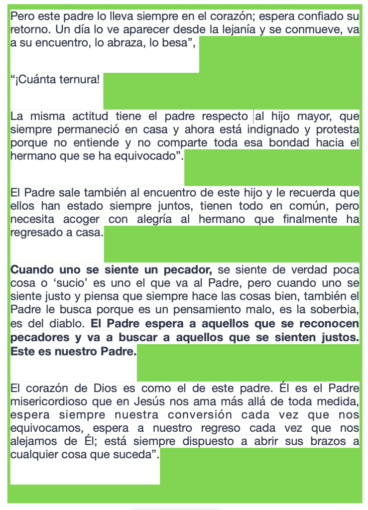 El corazón de Dios es como el de este padre. Él es el Padre misericordioso que en Jesús nos ama más allá de toda medida, espera siempre nuestra conversión cada vez que nos equivocamos, espera a nuestro regreso cada vez que nos alejamos de Él; está siempre dispuesto a abrir sus brazos a cualquier cosa que suceda”.