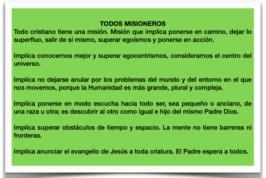 Todo cristiano tiene una misión. Misión que implica ponerse en camino, dejar lo superfluo, salir de sí mismo, superar egoísmos y ponerse en acción.